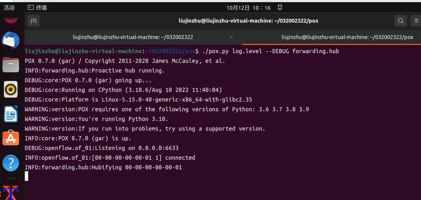 开启POX:./pox.py log.level --DEBUG forwarding.hub