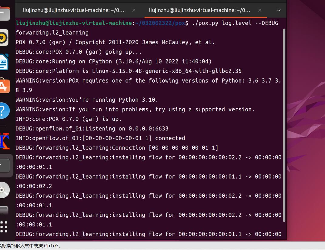 pox中运行./pox.py log.level --DEBUG forwarding.l2_learning