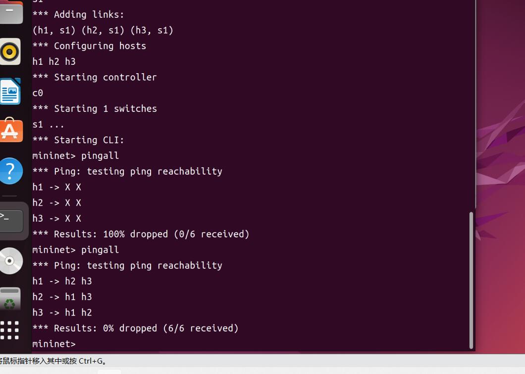 重新搭建(一)的拓扑,此时交换机内无流表规则,拓扑内主机互不相通;编写Python程序自定义一个POX模块SendFlowInSingle3,并且将拓扑连接至SendFlowInSingle3(默认端口6633),实现向s1发送流表规则使得所有主机两两互通。