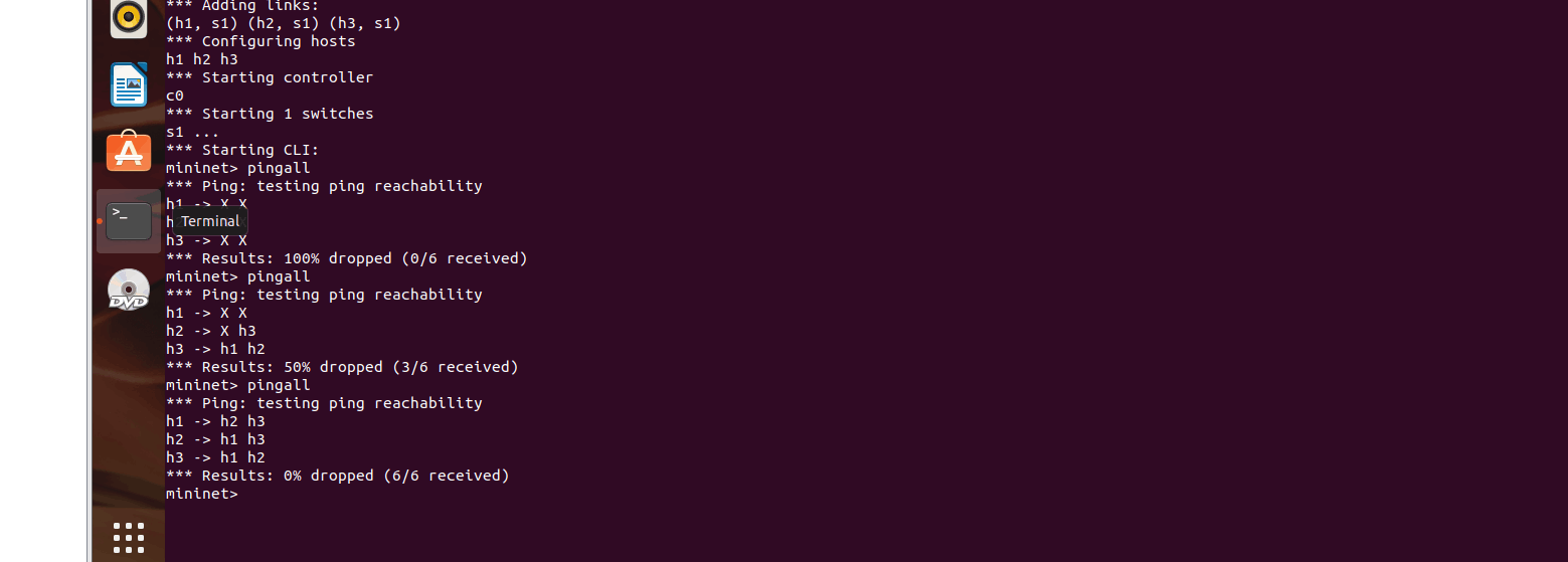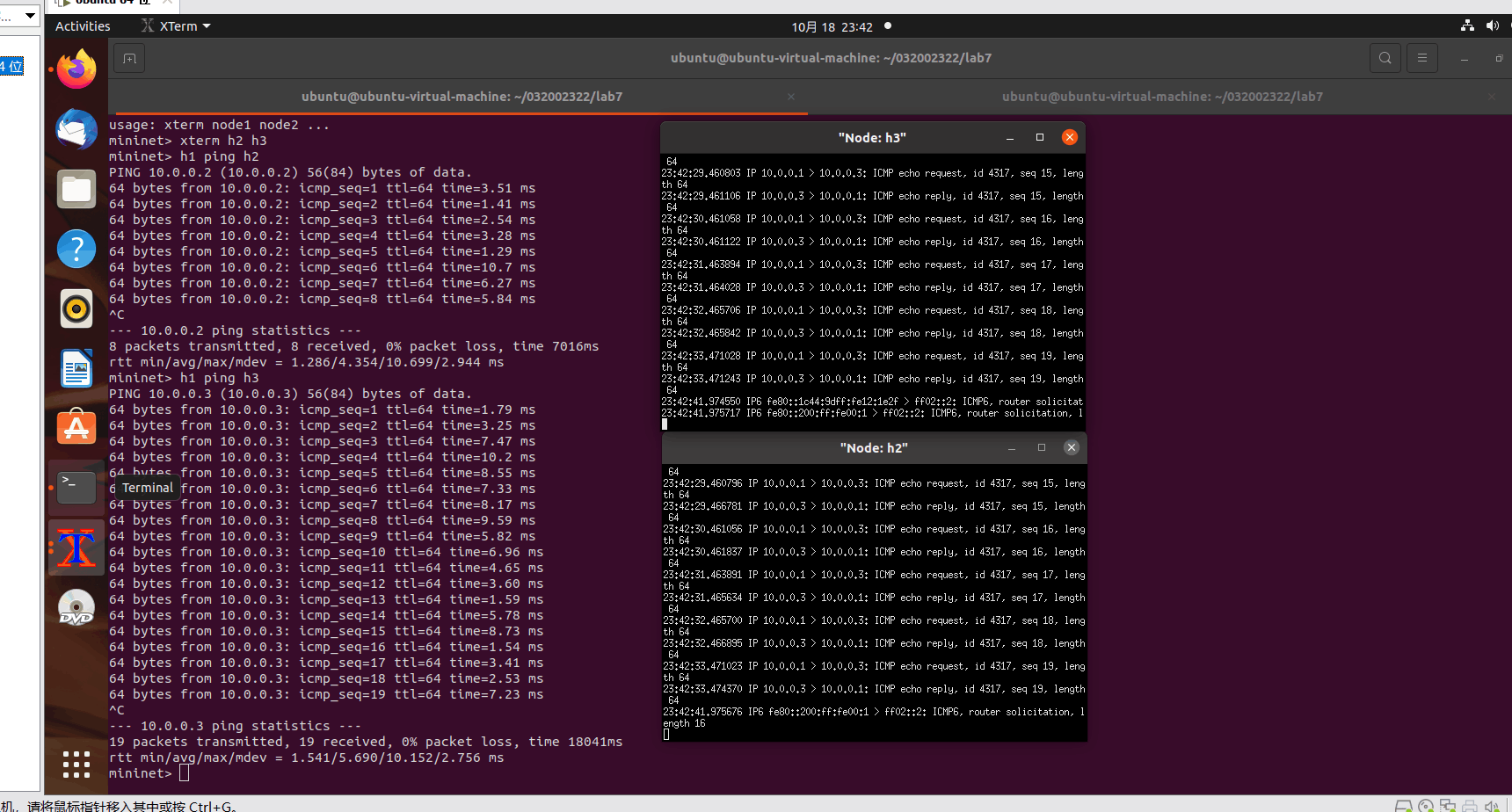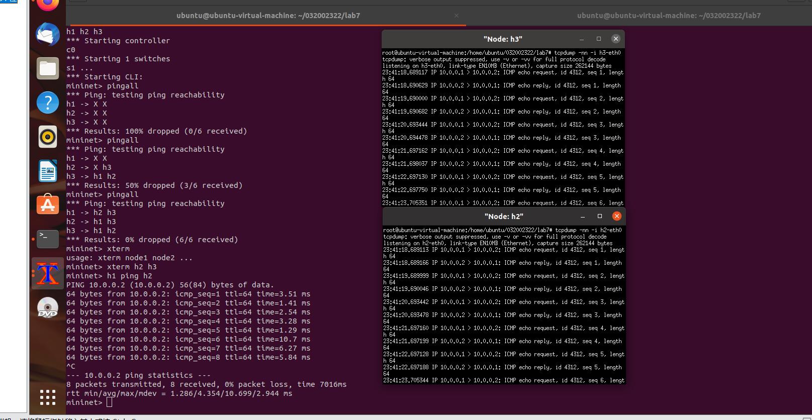 2.阅读Ryu文档的The First Application一节,运行当中的L2Switch,h1 ping h2或h3,在目标主机使用 tcpdump 验证L2Switch,分析L2Switch和POX的Hub模块有何不同。