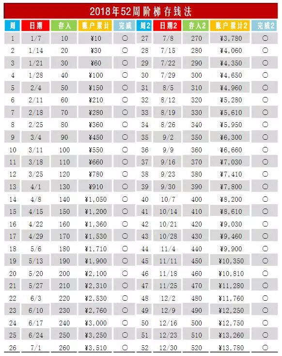 一年52周,每个礼拜存10元、20元、30元......,直到第52周存520元,但是坚持下来一年也能攒下13780元!