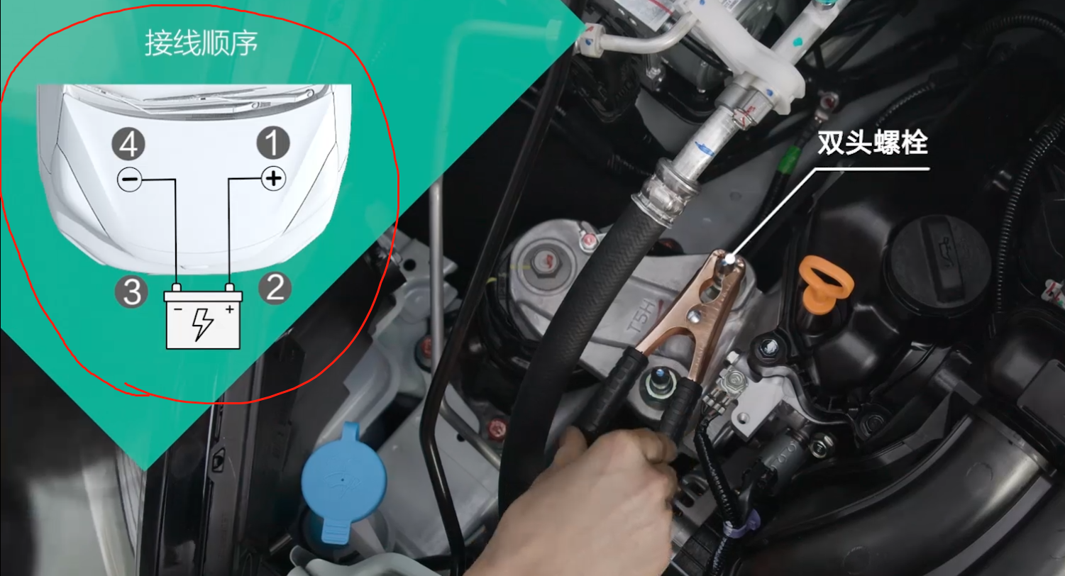 3.将第二根跨接线的一端连接至起动辅助蓄电池-极,并将第二根跨接线的另一端连接至双头螺栓。切勿将此跨接线连接至其他部件。