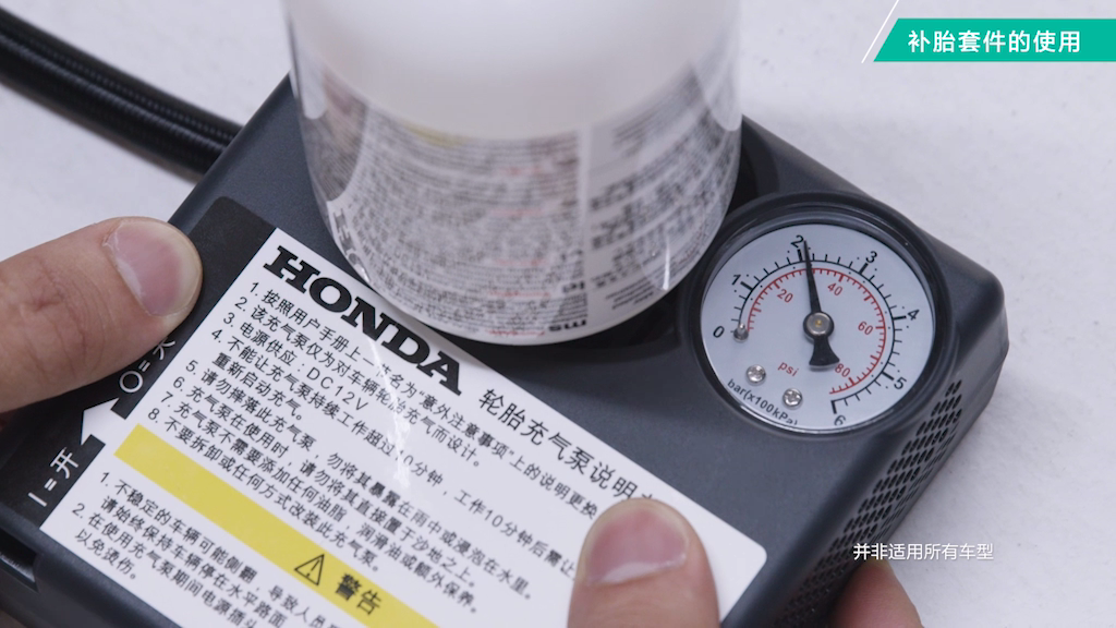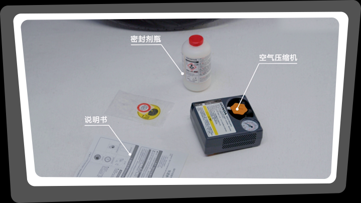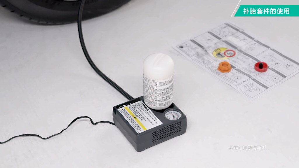 3.将补胎套件放在瘪胎附近的平坦地面上,并远离车流。请勿侧放补胎套件。