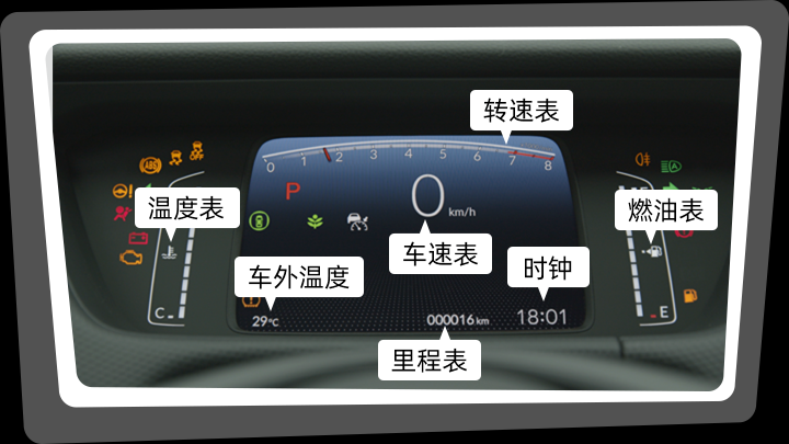 仪表包括车速表、燃油表等其他相关指示。当电源模式为 ON 时显示。