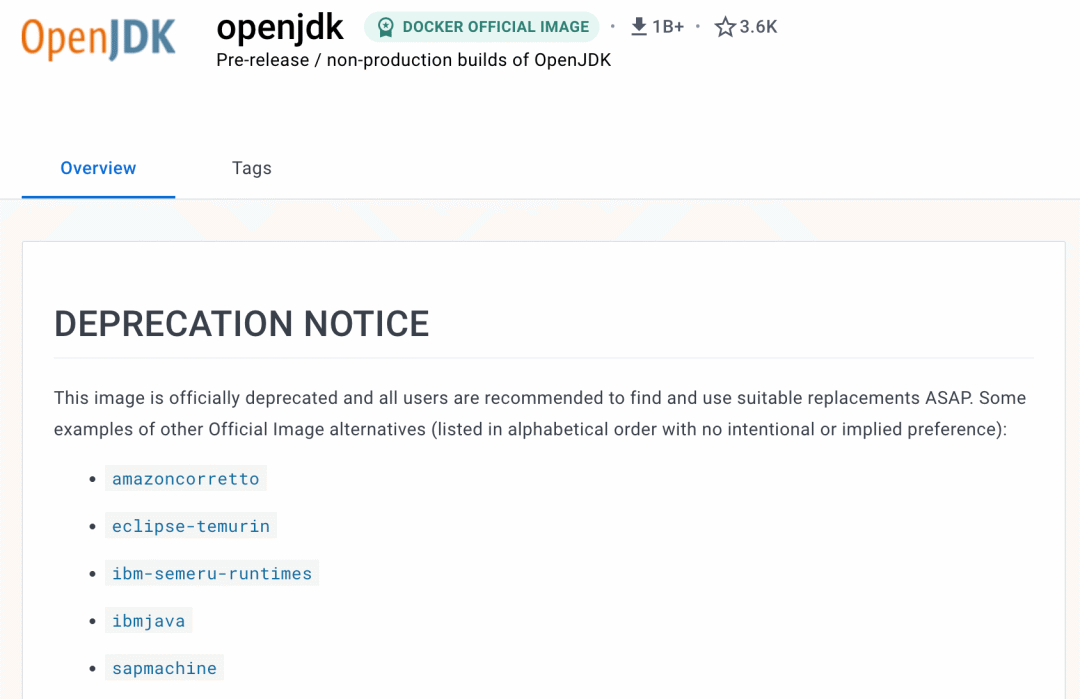 如果您已经使用 Dockerfile 构建了镜像,那么您可能使用的是来自 Docker Hub 的官方 OpenJDK 基础镜像。然而,目前,镜像网站上的公告称它已被正式弃用,所有用户都应该找到合适的替代品。我想这可能会让人很困惑,所以你会在这里找到对原因的详细解释。