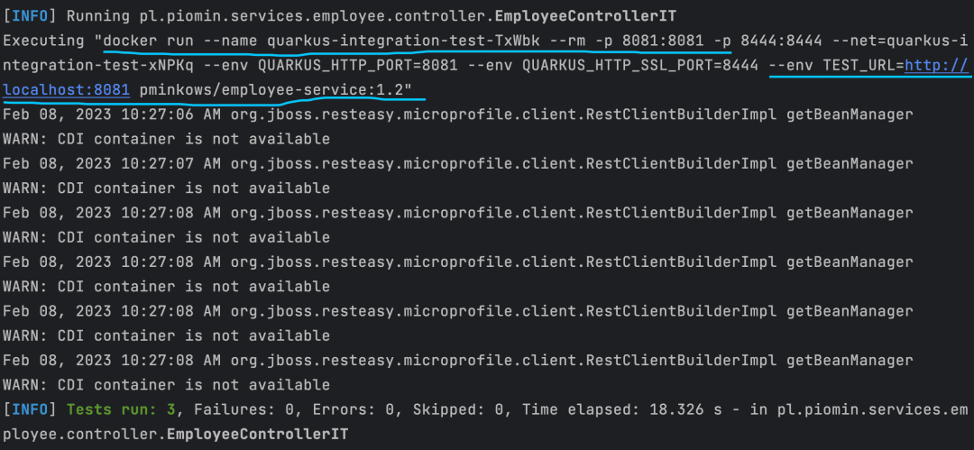 您可以在我之前关于使用 Quarkus 进行高级测试的文章中找到有关该过程的更多详细信息。最终效果如下图所示。当我们在构建期间使用 mvn clean verify 命令运行测试时,我们的测试在构建容器镜像后执行。