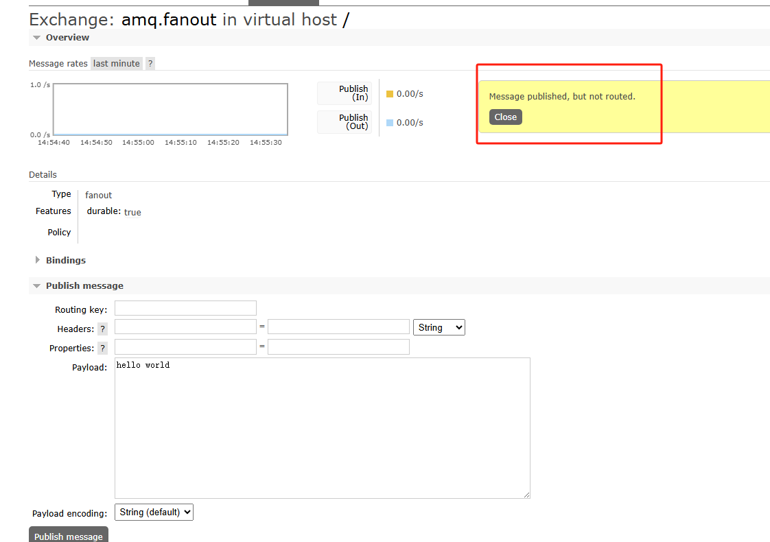 再次回到exchange页面,找到刚刚绑定的amq.fanout,点击进入详情页,再次发送一条消息: