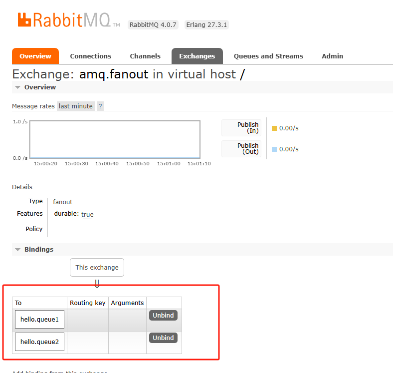 此时,再次向amq.fanout交换机发送一条消息。会发现消息依然没有到达队列!!