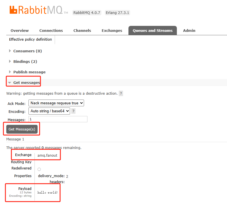 点击队列名称,进入详情页,查看队列详情,这次我们点击get message, 可以看到消息到达队列了: