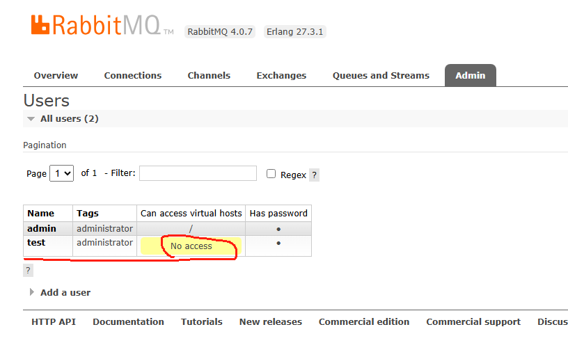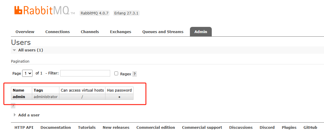 点击Admin选项卡,首先会看到RabbitMQ控制台的用户管理界面: