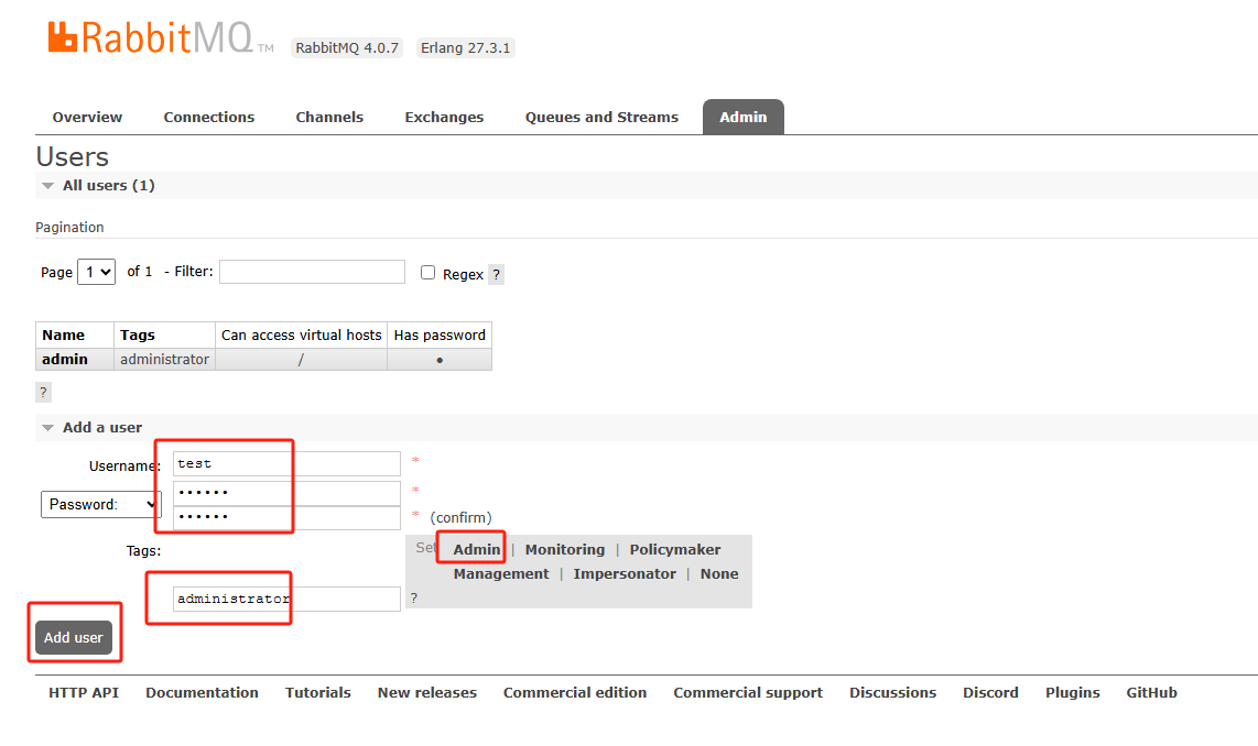 新创建一个用户,用户名是test,密码是123456,选择Admin的权限,就会自动填充进administrator