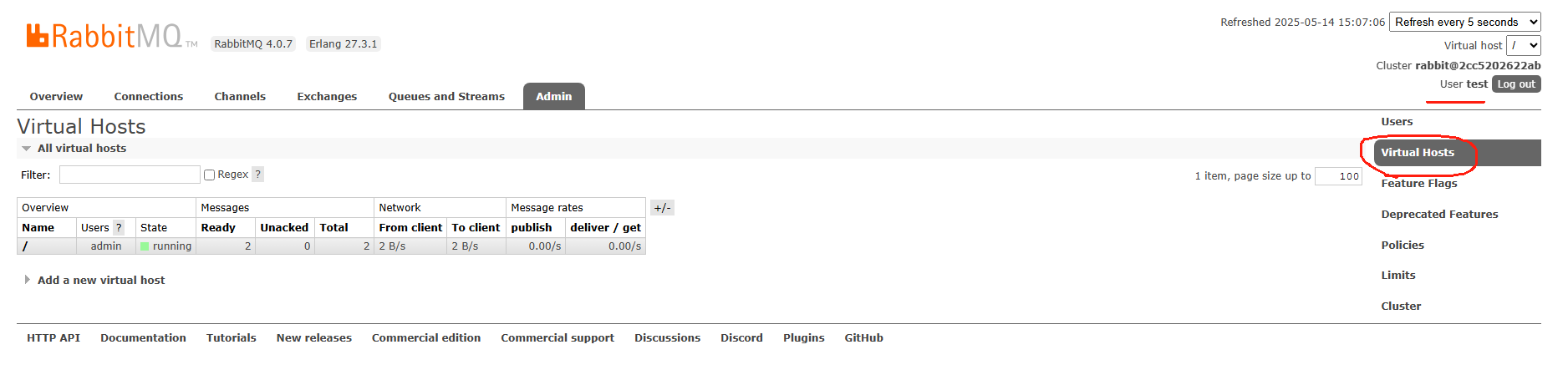 然后退出登录,切换到刚刚创建的test用户登录,然后点击Virtual Hosts菜单,进入virtual host管理页: