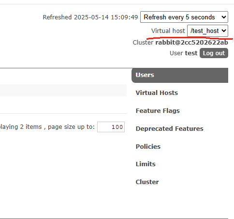 此时,点击页面右上角的virtual host下拉菜单,切换virtual host为 /test_host: