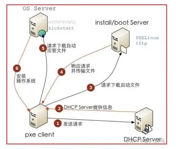 2. pxe server必须至少提供DHCP、TFTP、HTTPD(vsftpd 或 nfs)的服务,且还需满足如下要求: