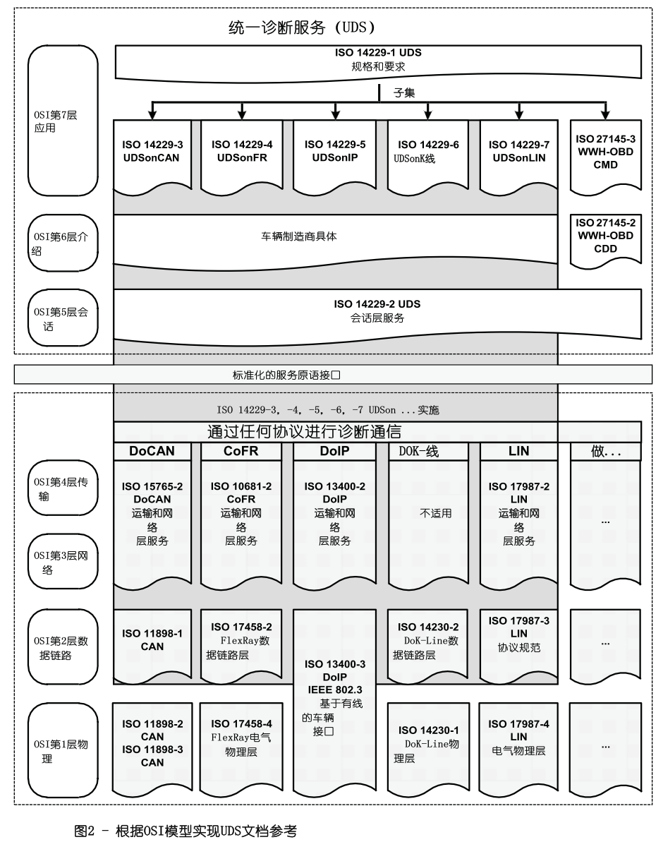 这张图描述了UDS在OSI七层模型中的应用,OSI的第一层第二层分别定义了物理层和数据链路层,第三层第四层定义了网络层和传输层,第七层是应用层。
