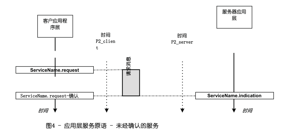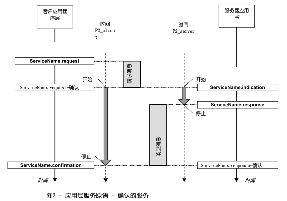服务原语定义服务使用者(比如,诊断应用)如何与服务提供者(比如,网络层)合作。有如下服务原语(请求,指示,确认):