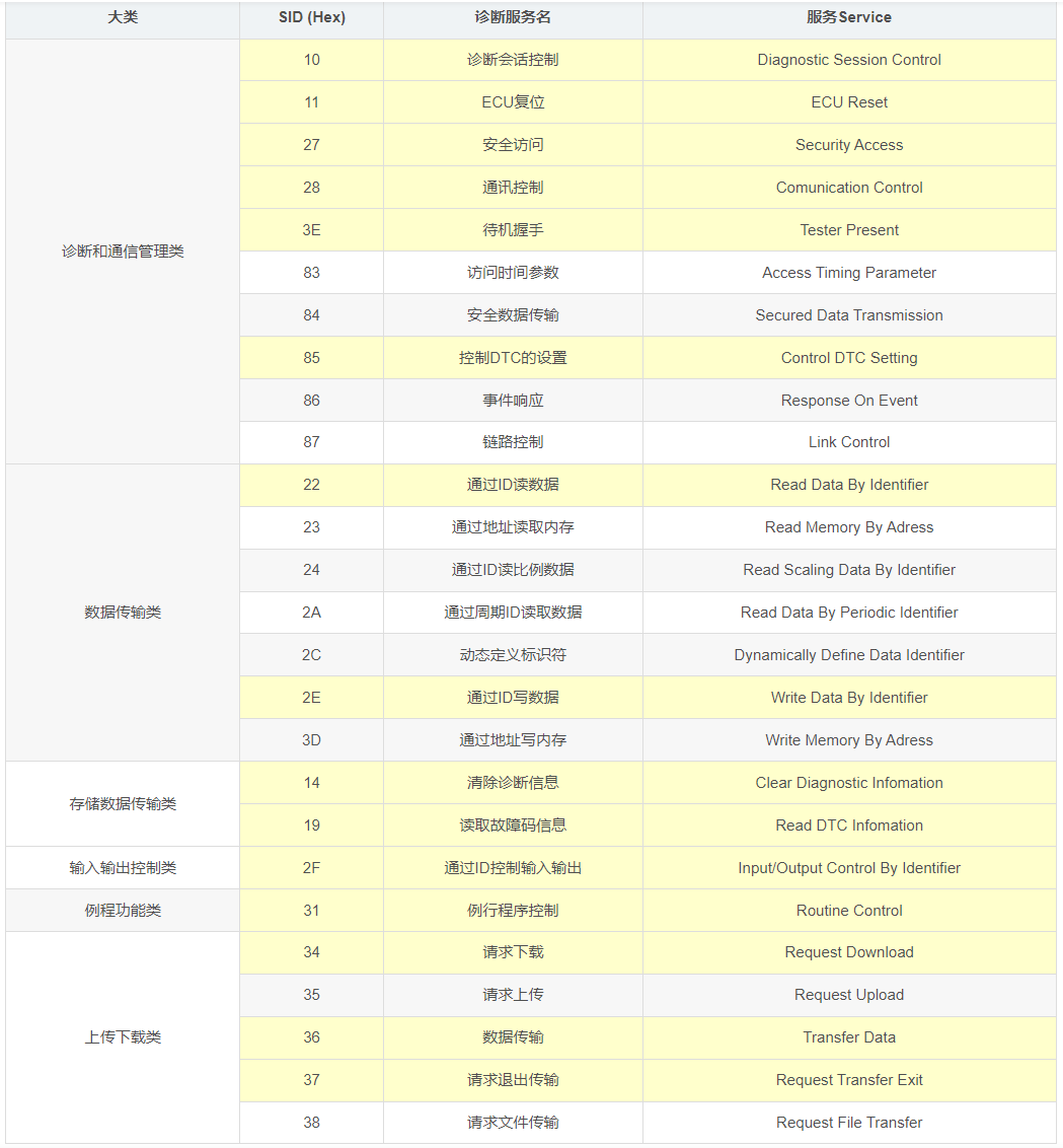 ISO 14229-1中定义了26种服务并将这些服务分为6大类:诊断和通信管理类、数据传输类、存储数据传输类、输入输出控制类、例程功能类、上传下载类。具体的服务说明如下图所示: