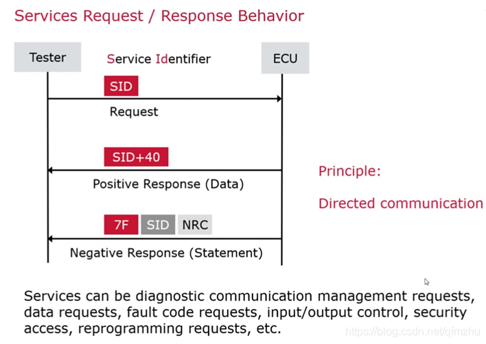 诊断仪请求第一个字节为Service Identifier (SID),代表诊断服务的标识符,如果ECU发送肯定响应,第一位为SID+40,例如0x22服务的响应SID为0x62;如果ECU发送否定响应,响应格式固定为第一字节0x7F,第二字节为SID,第三字节为Negative Response Code (NRC),根据NRC可以判断错误原因和位置。