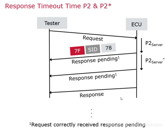 当Tester给ECU发送请求过后,ECU需要在P2Sever时间内给出相应的响应,如果ECU当前正在处理别的任务,处理别的事情,而不能在P2Sever的时间内给出相应的响应,那么它先在P2Sever时间内给出一个NRC为78的Pending报文,告诉Tester“ECU正在忙”,之后会在P2Sever*的时间内给出其它的响应报文,如果P2Sever*的时间内还是不能给出相应的肯定响应和否定响应,将继续给出Pending报文,直到能够正确处理请求报文之后,会给出正确的响应报文。