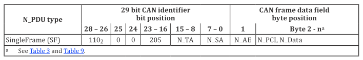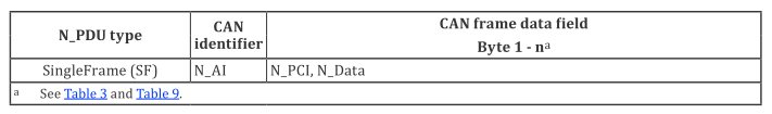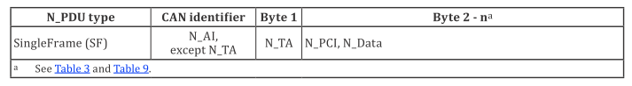 - SF N_PDU通过单帧协议控制信息(SF N_PCI)识别。 SF N_PDU应由发送网络实体发出,并被所有的网络实体接收。只有通过N_AI寻址到的唯一的实体,在整个分段帧传输期间应处理该请求。其他未被寻址到的节点应拒绝挂起中的连接。当可以通过单个的服务请求传递给数据链路层,以及传递不分段帧时,应发送SF N_PDU以传递服务数据单元。