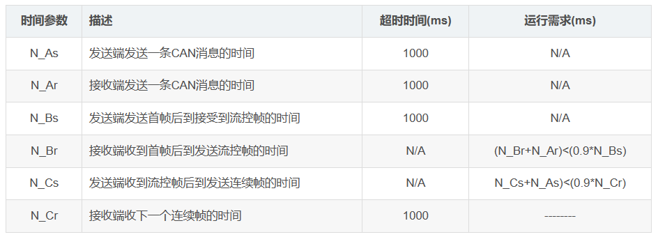 ——N_TIMEOUT_As:当计时器 N_As 的计时超过其超时值 N_Asmax 时,应在发送端发送该值给服务使用者;