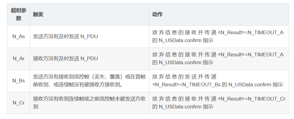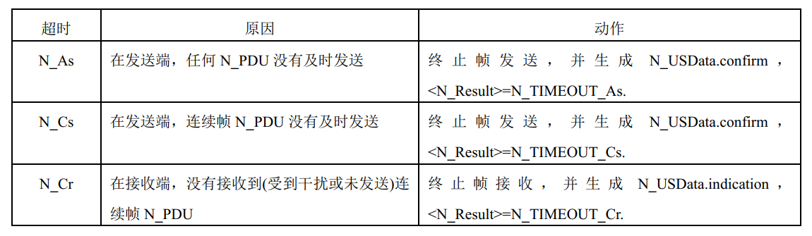 ——N_TIMEOUT_Cr:当计时器 N_Cr 的计时超过其超时值 N_Crmax 时,应在发送端发送该值给服务使用者;