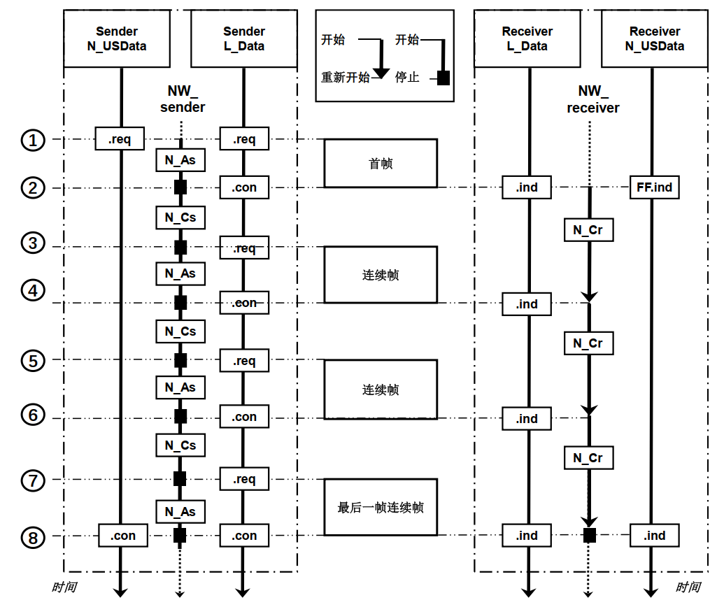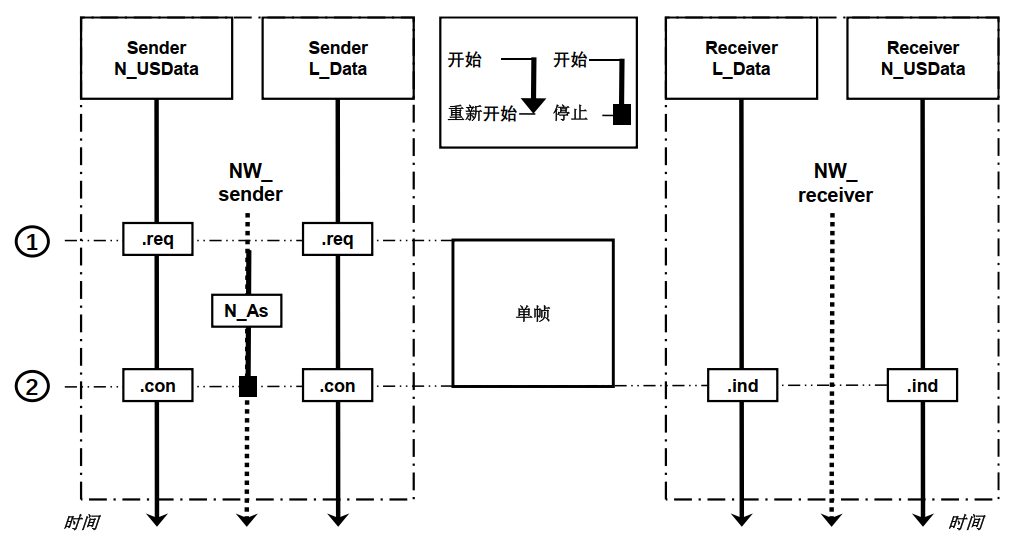 Sender L_Data.req: 传输层请求向数据链路层发送单帧,并启动N_As定时器。该框图表示数据链路和传输层之间的时序关系,并不代表实际的总线报文调度。