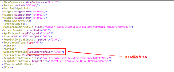 2 定位到DesignerVersion 段 10.0 版本号是KAA,修改为需要低版本代号,8.0是IAA