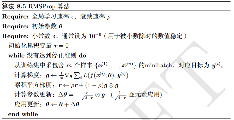 的估计修正偏置(算法8.7)。 RMSProp 也采用了(非中心的)二阶矩估计,然而缺