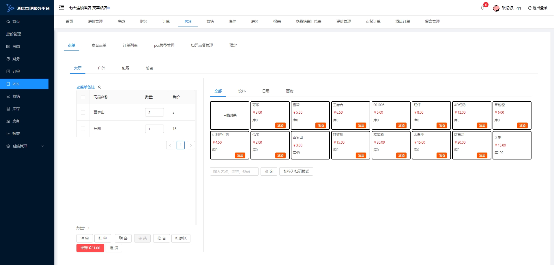 库存:管理和监控酒店的商品库存,包括客房用品、餐饮原料和销售商品,设置库存的预警水平。