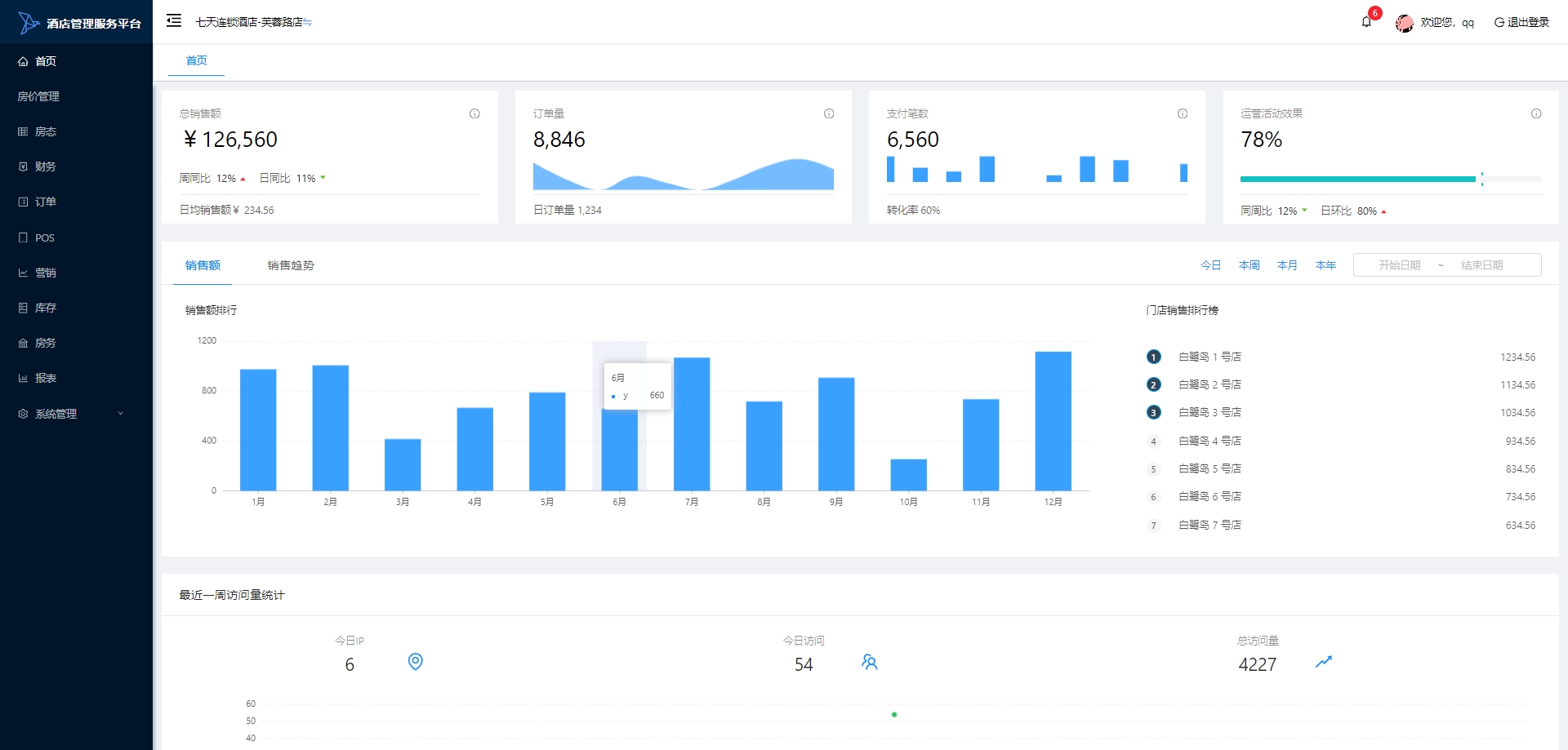 酒店管理系统是一款为酒店行业设计的全面管理软件,旨在通过集成酒店运营的各个关键环节,提高酒店的管理效率和客户满意度。系统提供了从登录系统、首页概览、房价管理、房态监控、财务管理、订单处理、POS操作、营销活动、库存管理、房务管理、报表生成到系统管理等全面的管理功能。系统的设计考虑了用户的易用性和数据的实时性,确保了酒店运营的准确性和安全性。