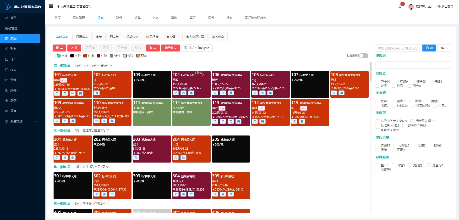 房态:实时查看酒店的房间状态,包括已入住、空置、维修中等,有助于前台快速为客人分配房间。