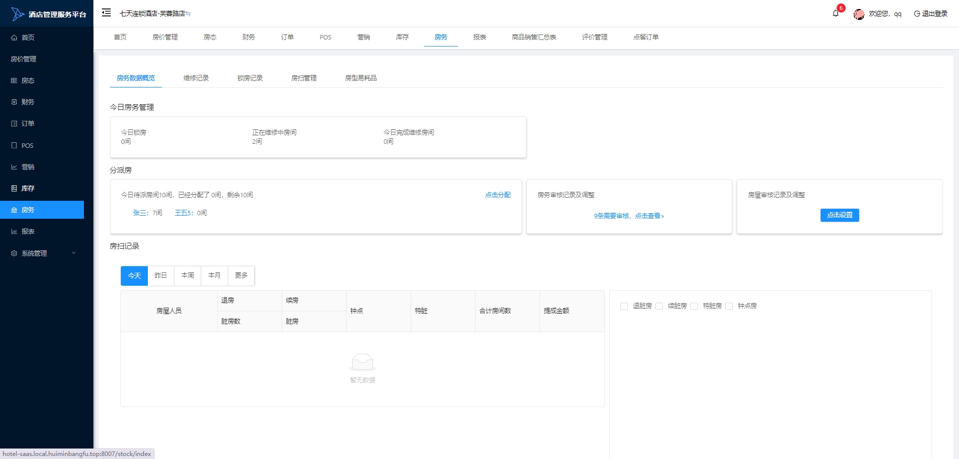 房务:管理和跟踪客房的清洁和服务工作,包括房间的清洁安排、客房服务请求和维修工作。