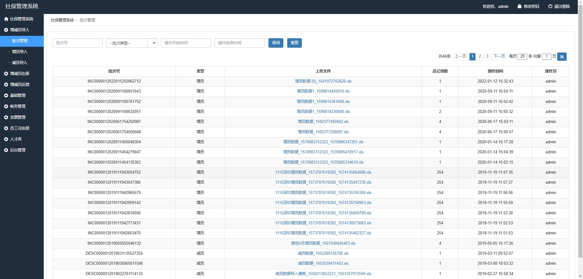 批量管理:对增减员操作进行批次处理,便于统一管理。