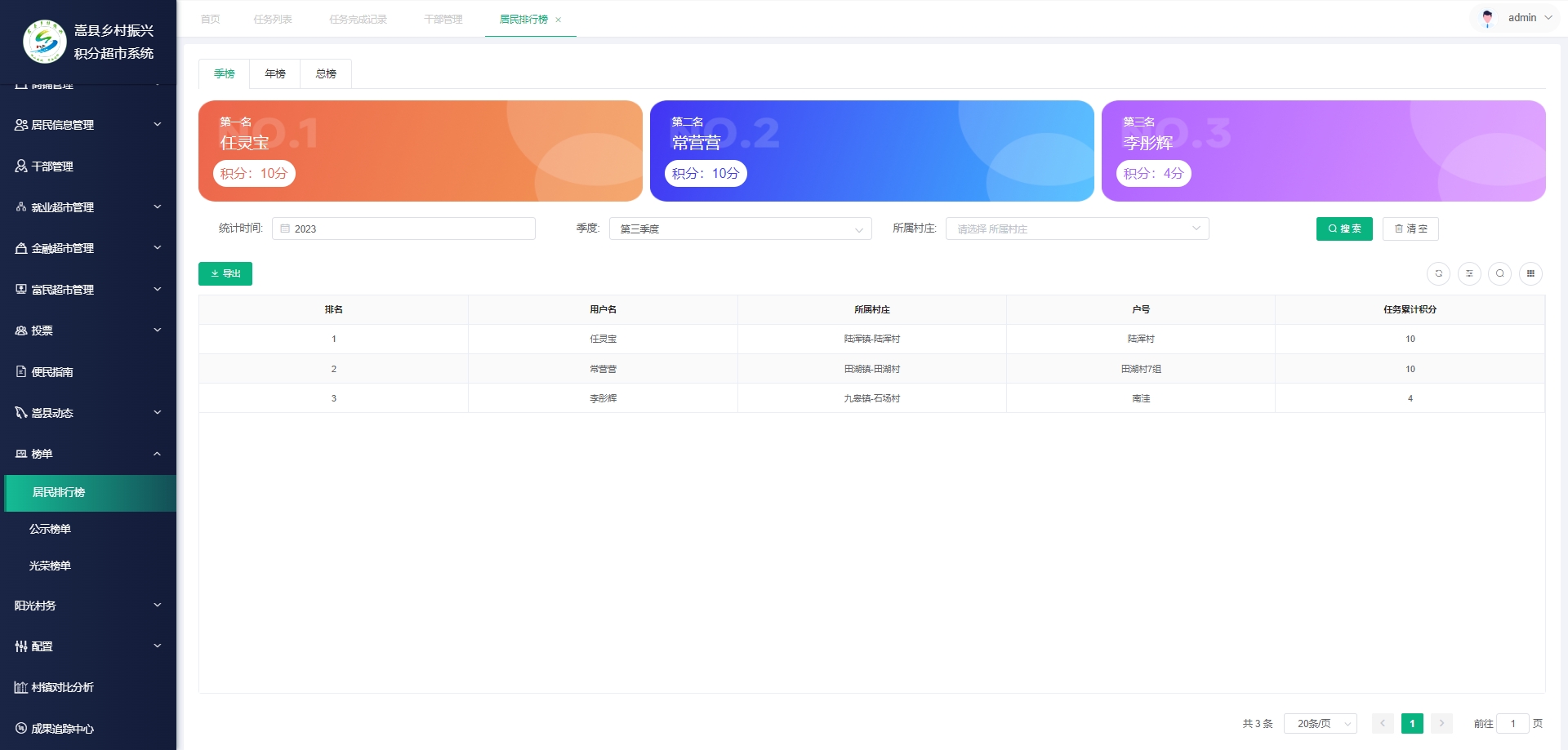 乡村振兴积分系统是一个综合性的管理平台,旨在通过积分制度激励居民参与乡村建设,提升乡村治理水平。系统涵盖了实体卡管理、积分任务管理、商铺管理、居民信息管理、干部管理、金融超市管理、便民指南、施县新闻、榜单管理、阳光村务、配置管理、系统管理等多个模块,全面支持乡村振兴的各个方面。
