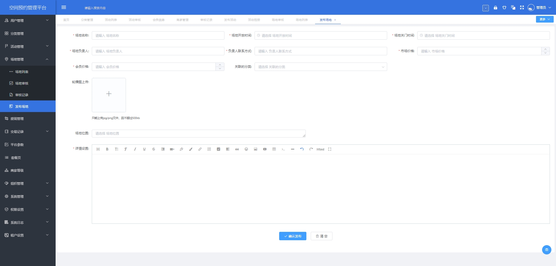 发布场地:允许用户发布新的场地信息。