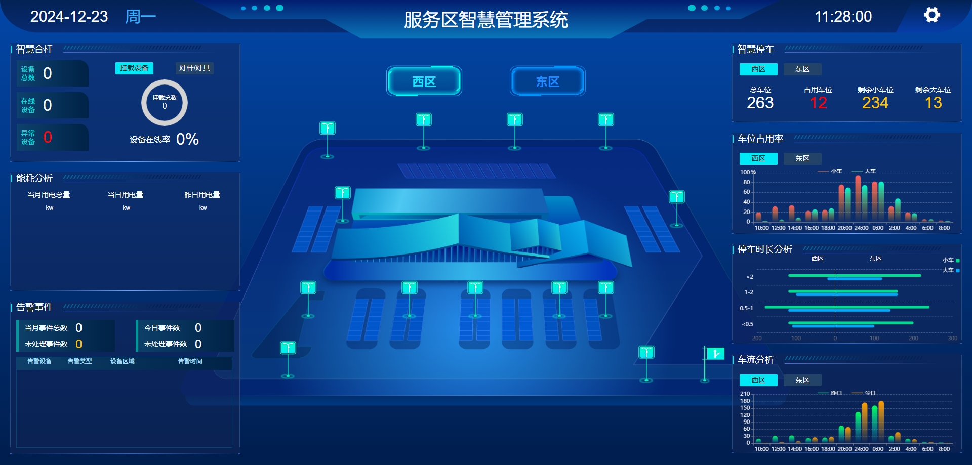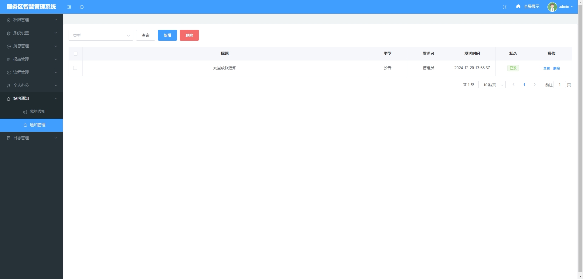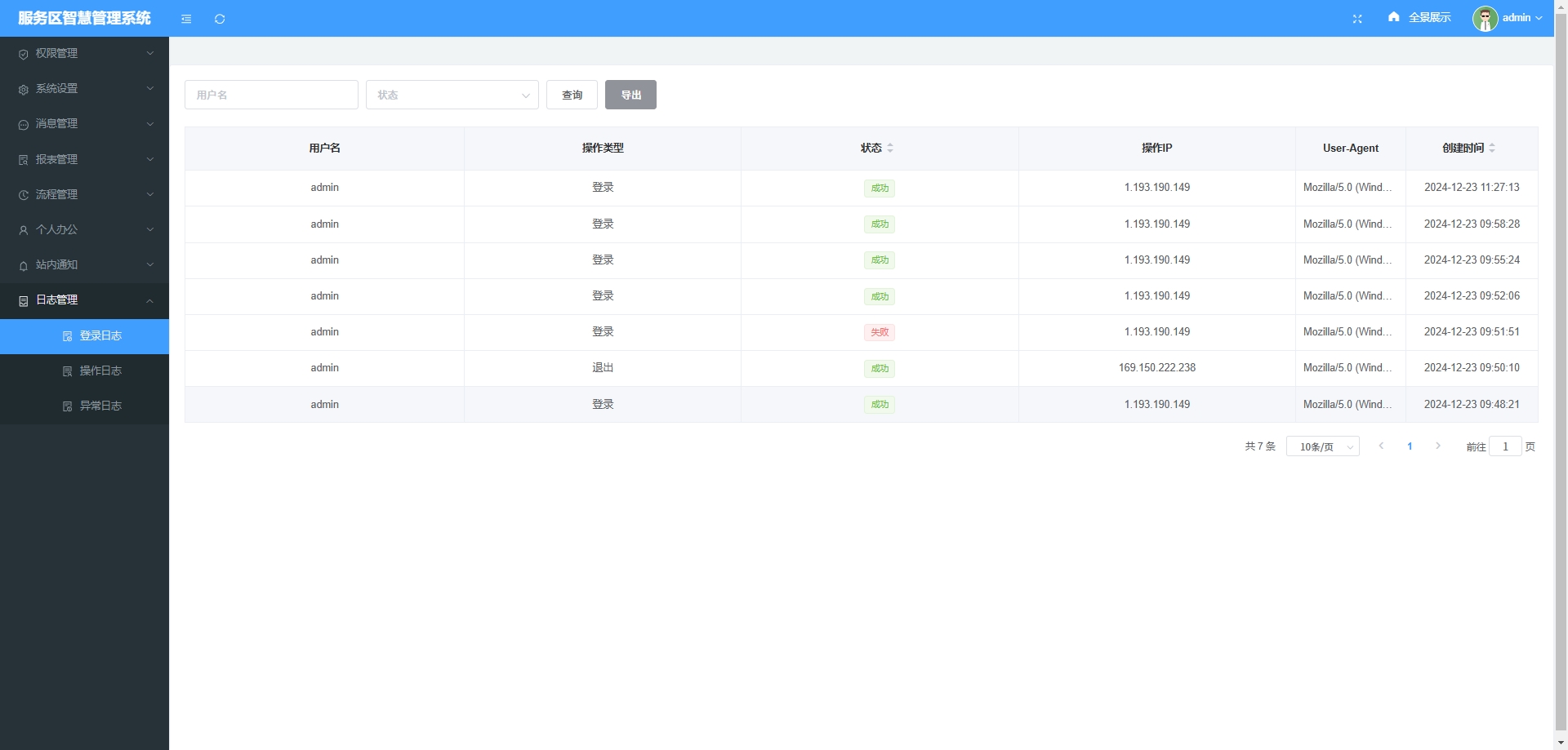 服务区智慧管理系统是一个综合性的管理平台,旨在提高服务区的运营效率和管理质量。系统通过权限管理、消息管理、报表管理、流程管理、个人办公、站内通知、日志管理和系统设置等模块,为用户提供全面的服务区管理解决方案。