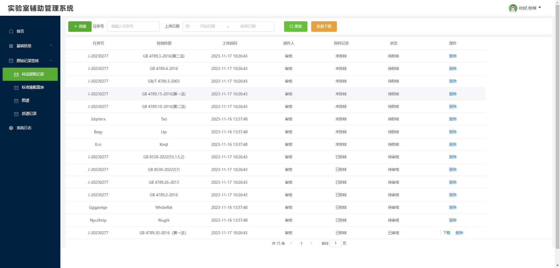 称样单列表:展示所有称样单的概览,包括检测项目、任务号、检测依据、发布信息和状态。