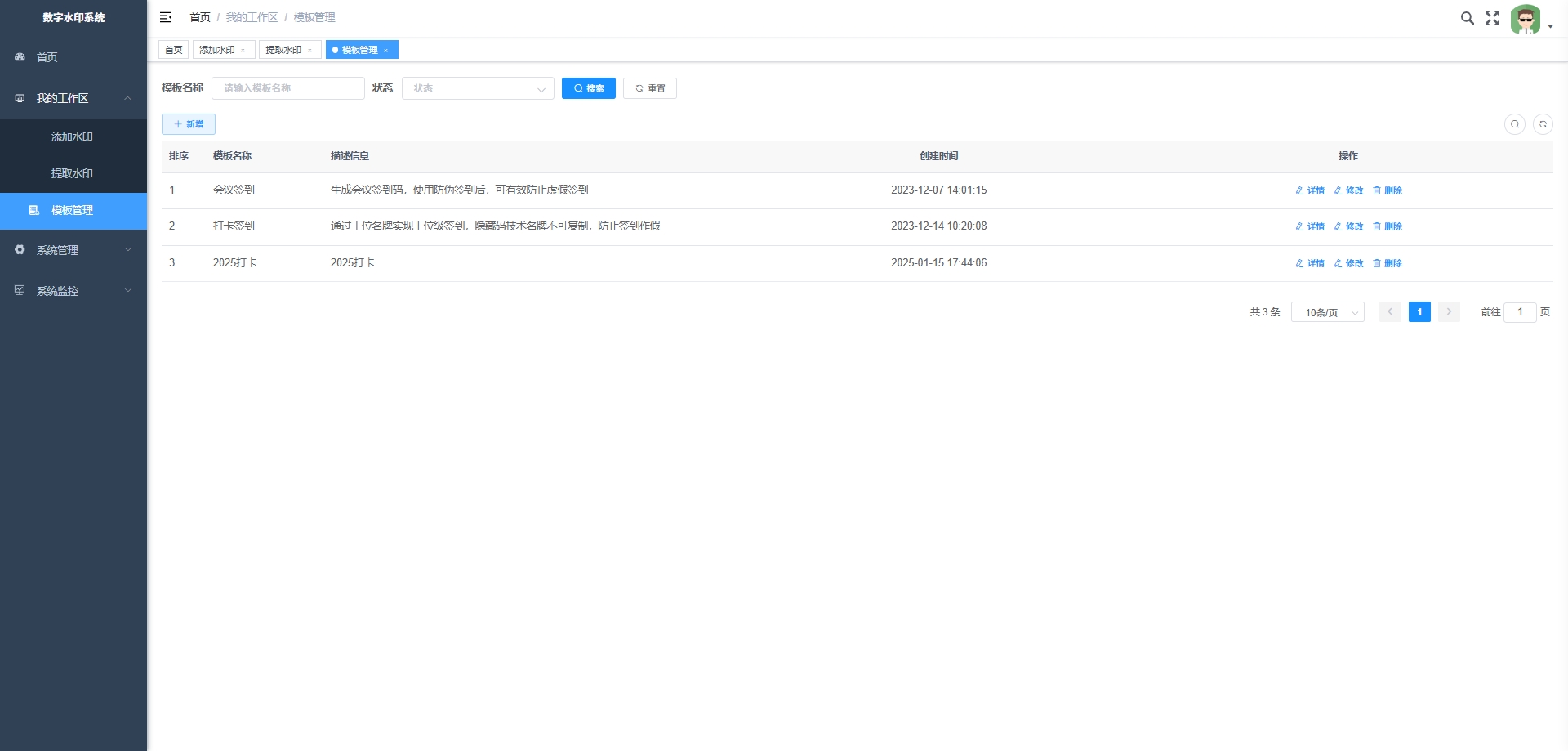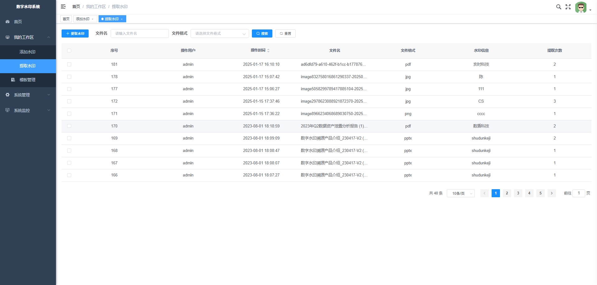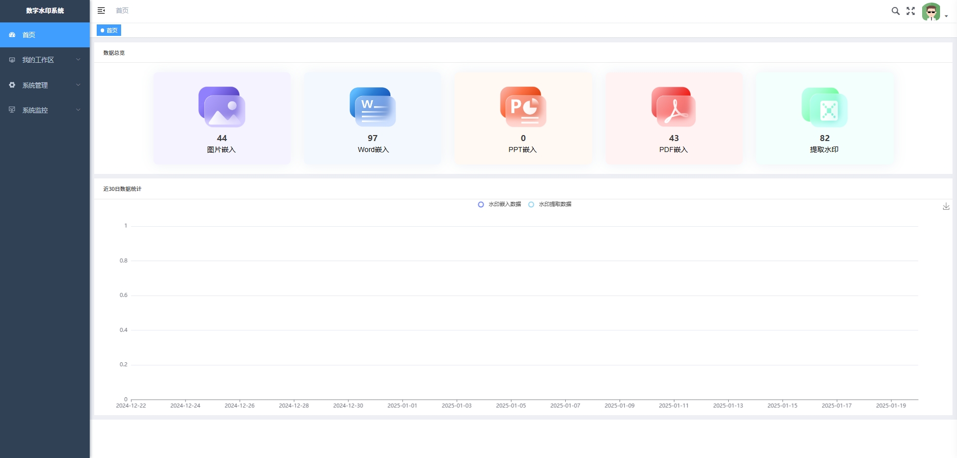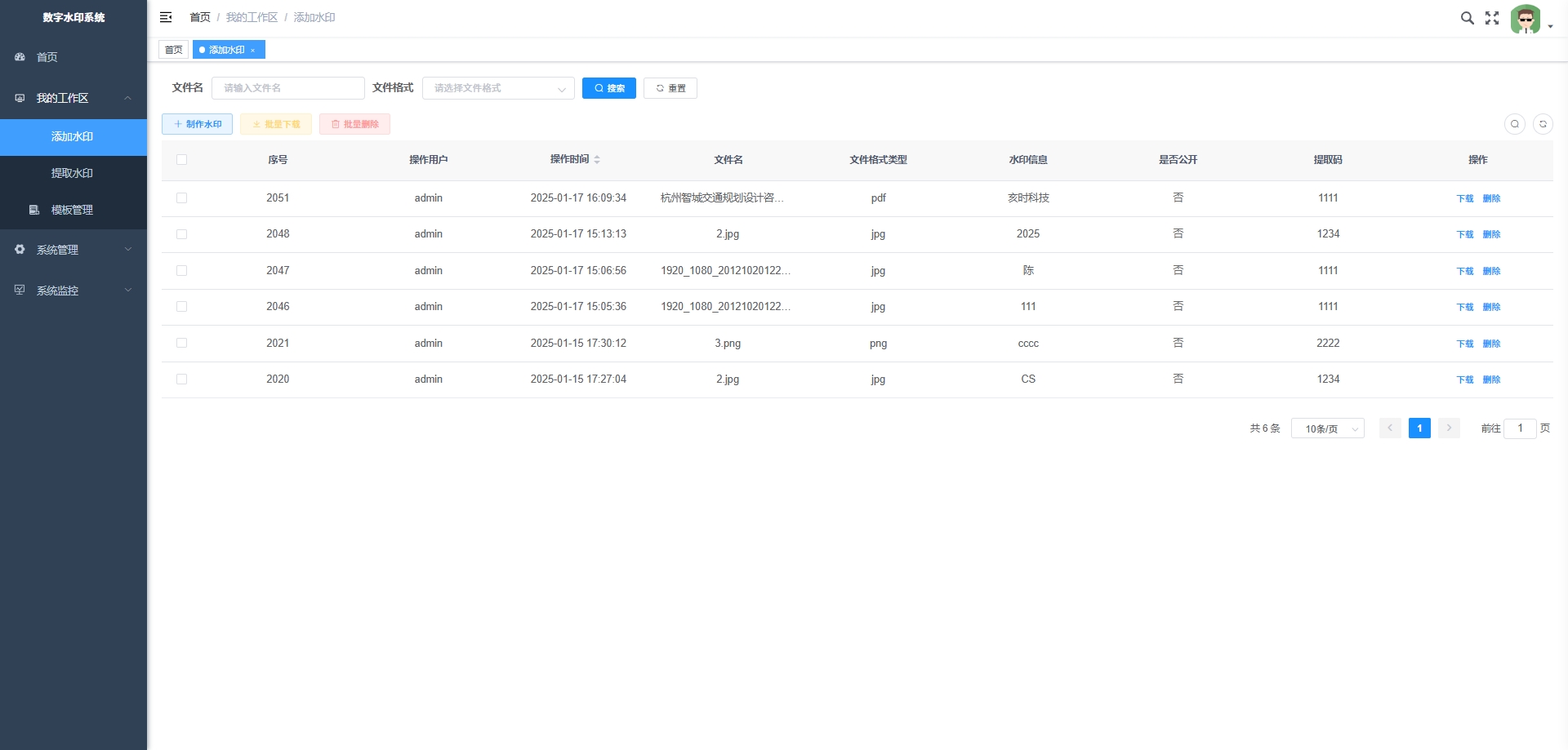 - 我的工作区:包括添加水印、提取水印等功能,用于版权保护或标识。