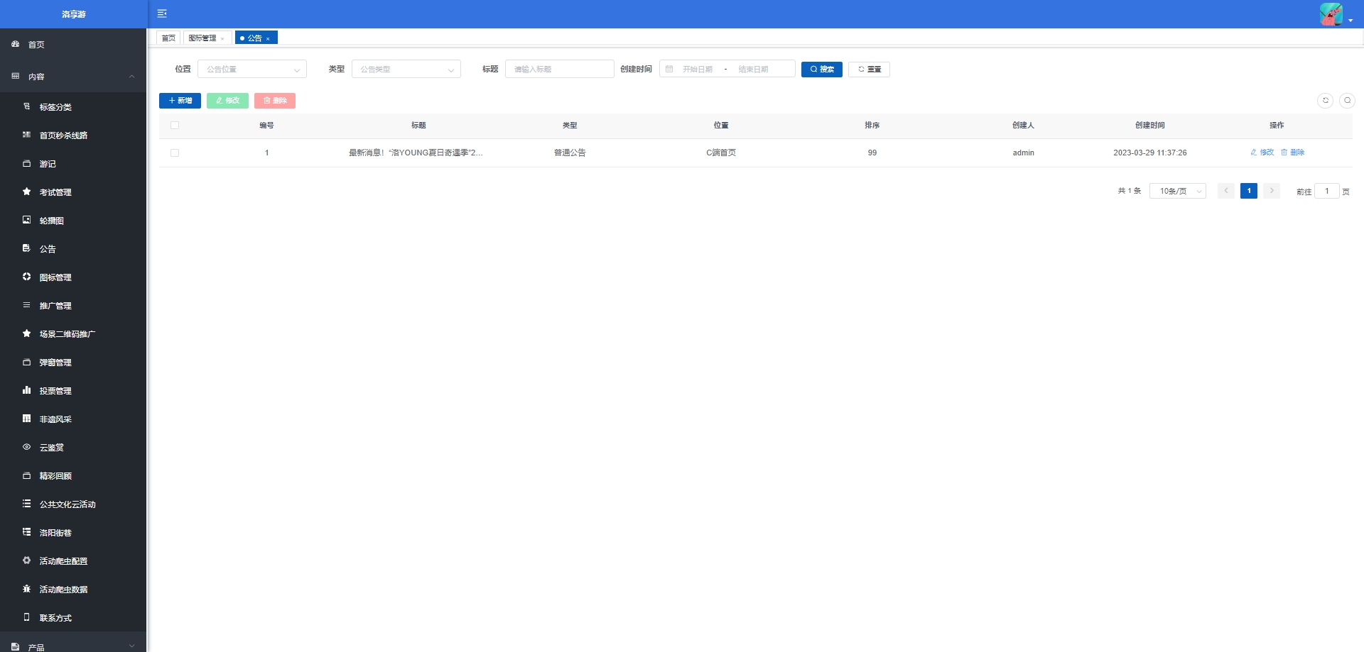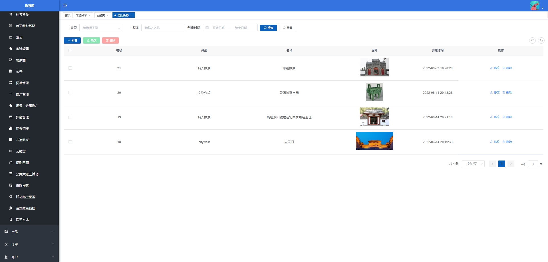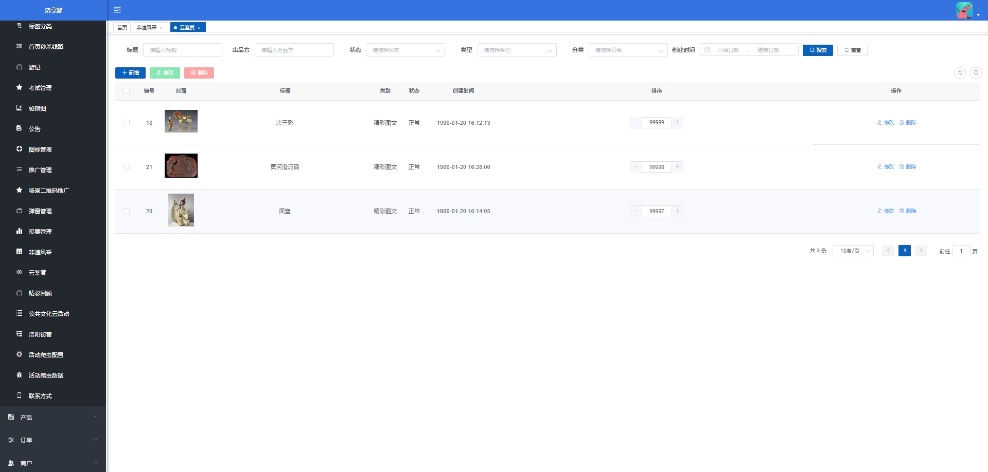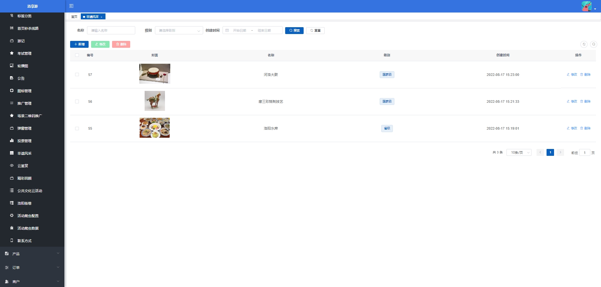 - 非遗管理:展示和介绍非物质文化遗产相关的信息或活动。