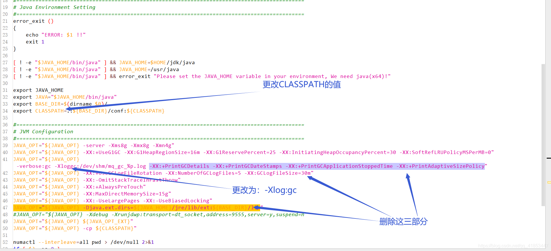 (2)JAVA_OPT="${JAVA_OPT} -XX:+UseGCLogFileRotation -XX:NumberOfGCLogFiles=5 -XX:GCLogFileSize=30m"