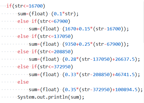 本题的难度主要体现在对题目的理解以及对数字的运算,不要被题目各种税率和计算方法的复炸给吓到,认真观察其实很容易发现他们的规律,在每个收入阶段加以修改即可。这里给出其中一种情况的判断情况,可以看出只要掌握方法,就变得十分简单
