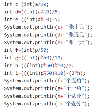 本题的难点在于算法,只要理清楚如何将一个float类型的数分解成我们所理解的n个十元,n个五元,n个一元等即可。