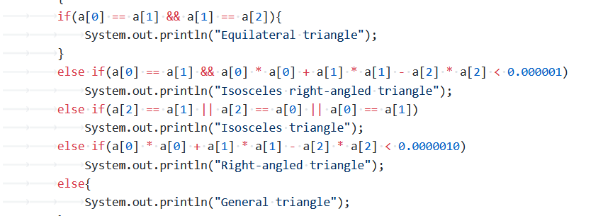 这道题是比较有难度的一道题,首先要按顺序去考虑其是否能构成一个三角形,这边我选择使用“两边之和大于第三边”的定理来进行判断,筛选出不能够构成三角形的数据。然后按顺序去判断其是否构成等边三角形,等腰直角三角形,直角三角形和等边三角形。