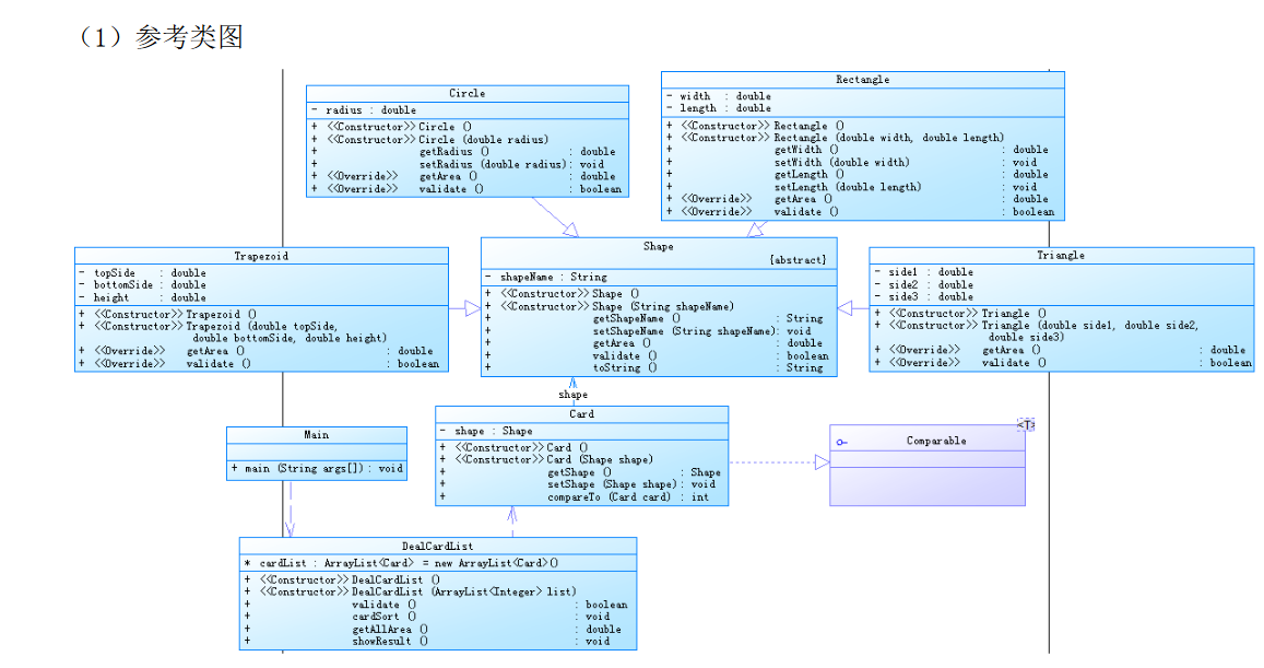 按照类图指引,我们可以看到除了常规三角形类,梯形类,圆形类,矩形类作为子类以及图形类的父类,还有一个接口。(虽然接口的内容什么都没有),根据题目要求,我们只需要在父类中定义求面积的方法,然后在各子类中重写对应的求面积方法即可。对其进行同步排序也是只需要运用一个数组进行同步标记,然后根据类型和大小来进行排序,正常输出即可,没什么难度。下面是代码。
