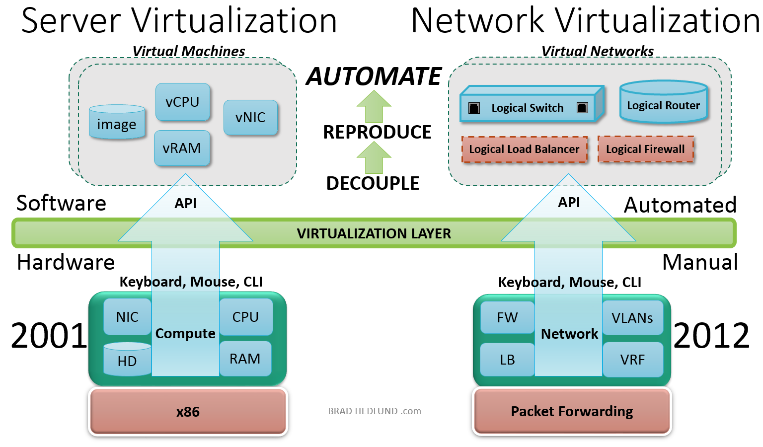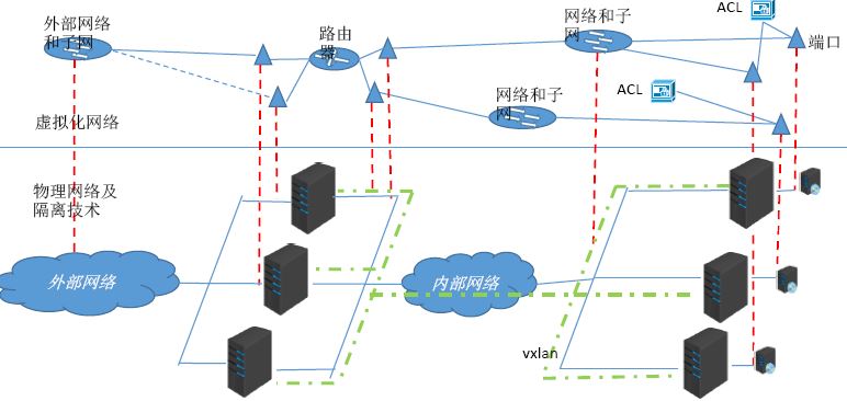 - (1)二层到七层网络的虚拟化:L2(virtual switch)、L3(virtual Router 和 LB)、L4-7(virtual Firewall )等