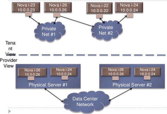 而云架构往往是多租户架构,这意味着多个客户会共享单一的物理网络。因此,除了提供基本的网络连接能力以外,云还需要提供网络在租户之间的隔离能力;同时云是自服务的,这意味着租户可以通过云提供的 API 来使用虚拟出的网络组建来设计,构建和部署各种他们需要的网络。