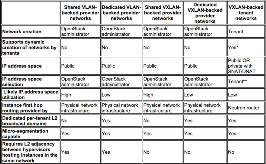 (2)Neutron 为每个 provider/tenant network 分配一个唯一的 segmentation_id。该 ID 的数目是影响可扩展性的因素之一。在规模不大的私有云中,往往是用 VLAN 模式,简单、可靠、能够满足规模要求;而在大型的私有云或者公有云中,往往使用 VxLAN。
