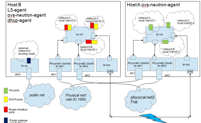 这种网络是可以在多个租户之间共享的。这种网络通过计算和网络节点上指定的 bridge 直接接入物理网络,所以默认的情况下它们是可以路由的,因此也不需要接入 Neutron Virtual Router,也不需要使用 L3 agent。使用这种网络,必须预先在各计算和网络节点上配置指定的网桥。