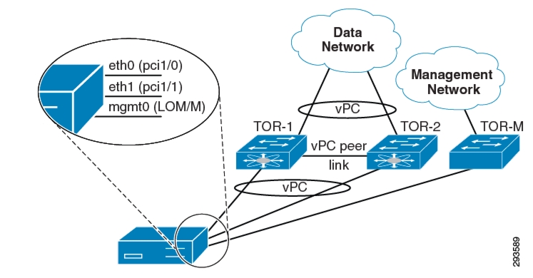 (图1, 来源:Cisco 网站。 TOR:Top On Rack 交换机。图中的一个服务器有三块网卡,分别连到连接数据网络和管理网络的交换机。)